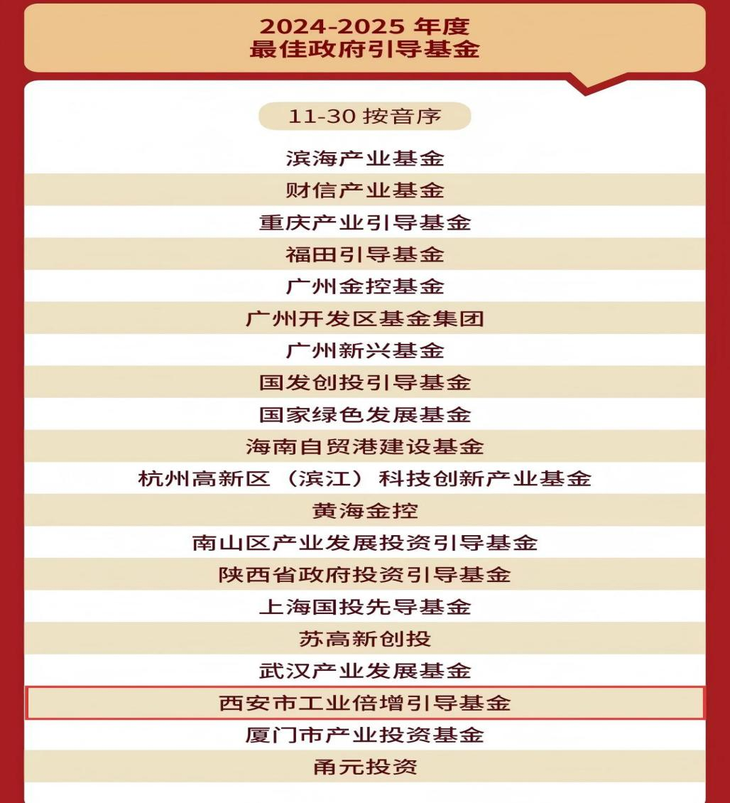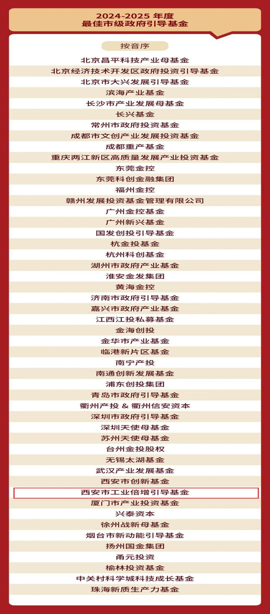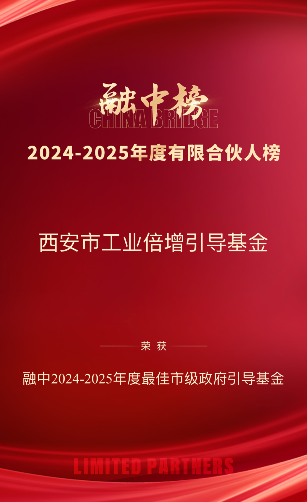 2025年7月23日,融中發(fā)布2024-2025年度有限合伙人榜單。由西安投資控股負(fù)責(zé)市場化運(yùn)作的西安市工業(yè)倍增引導(dǎo)基金榮獲“2024-2025年度最佳政府引導(dǎo)基金”“2024-2025年度最佳市級(jí)政府引導(dǎo)基金”。這是繼獲得清科“2025年中國政府引導(dǎo)基金50”“2025年中國地市級(jí)政府引導(dǎo)基金30強(qiáng)”榜單后,西安市工業(yè)倍增引導(dǎo)基金今年斬獲的又一行業(yè)權(quán)威榮譽(yù)。
